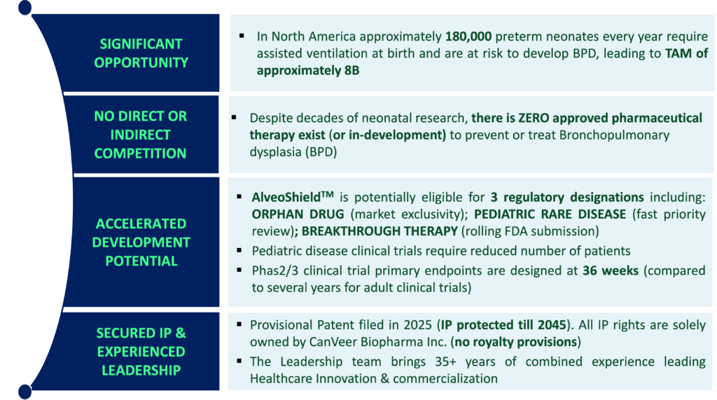 Canveer Biopharma is currently seeking seed funding to advance AlveoShield™ through IND-enabling studies and regulatory alignment. We are also interested in strategic partnerships with Foundations & Organizations committed to advancing neonatal health.